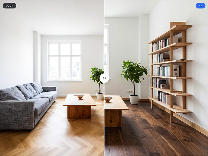 Bezoekers die hun vloer zien liggen in hun eigen huis converteren drastisch beter. Geen extra advertentiebudget, gewoon meer uit je bestaande verkeer halen.